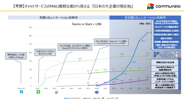 こうしてプライベートとビジネス、両側の世界でチャット文化が進行する中、後発ながら日本企業に広くビジネスチャットを浸透させる存在としてMicrosoft Teamsが登場します。実はマイクロソフトもSlackの買収を画策していた時期があったとも言われています。しかし結果的には、2011年に買収した「Skype for Business」をベースに、2017年にTeamsを自社開発でローンチします。これが、現在のビジネスチャットを語るうえで欠かせない“巨大エコシステム”の始まりでした。
