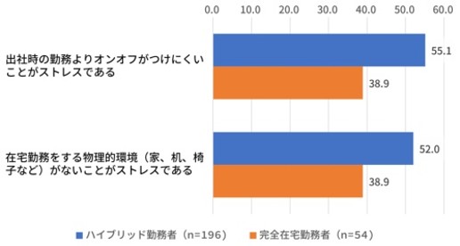 ・「出勤時の勤務よりオンオフ(仕事とプライベートの切り替え)がつけにくいことがストレスである」(55.1%)