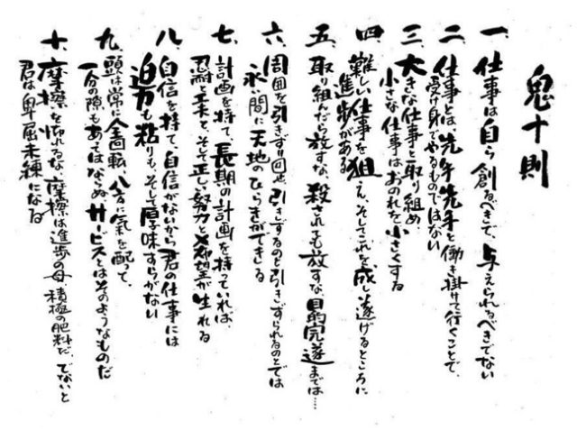 個々の説明やコメントは略させていただきますが、深いです。いろいろと考えるものがあります。ひとつひとつをテーマにコラムを書けます。そして一般的に「十則」で有名なのは「電通鬼十則」というものです。