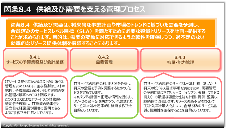 適切な能力管理を行うことで、需要の増加に対応できずサービスが停止するリスクを低減し、常に合意されたサービスレベルを維持できるようになります。このようにISO/IEC 20000-1:2018(JIS Q 20000-1:2020)の箇条 8.4 「供給及び需要」は、サービスの提供能力とそれに対する需要を経済的かつ安定的にバランスさせるための重要な活動を規定しています。サービスの提供組織が顧客の期待に応えつつ、経営資源を最適に活用し、競争力のあるサービスを継続的に提供するための不可欠な戦略的・運用的な枠組みとなります。