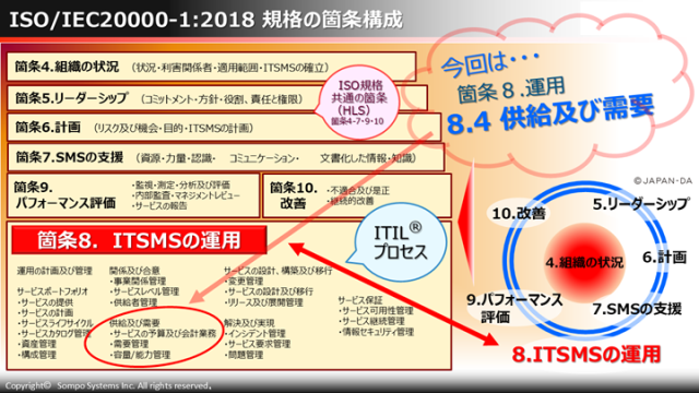 今回は幸福度を向上させるサービスマネジメント=ISO/IEC20000-1:2018の箇条8運用における8.4項の供給及び需要について確認していきます。サービスマネジメントシステムの箇条8 SMSの運用は、図1のとおり、幸福度を向上させるサービスマネジメント活動の中でも、顧客向けサービスの提供に関する重要な箇条となります。