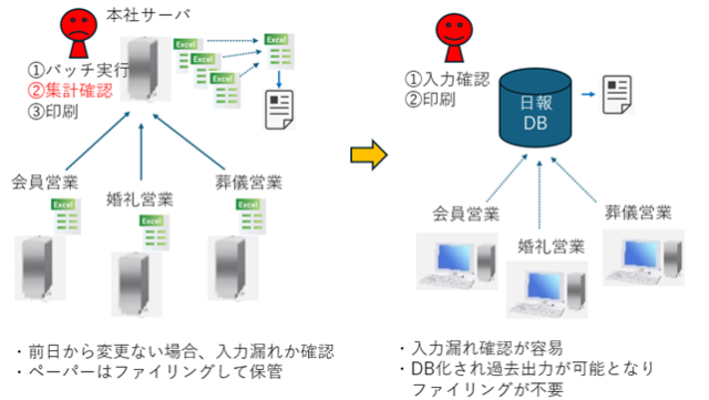 会計システムの入替をきっかけに、販売管理システム(冠婚葬祭)と会計システムへの2重入力を削減するプロジェクトが発足しました。販売管理システムから会計システムへ自動仕分けをバッチ処理で連携する事で、営業担当者と経理担当者それぞれで入力していた作業を営業担当者のみに削減するというものになります。