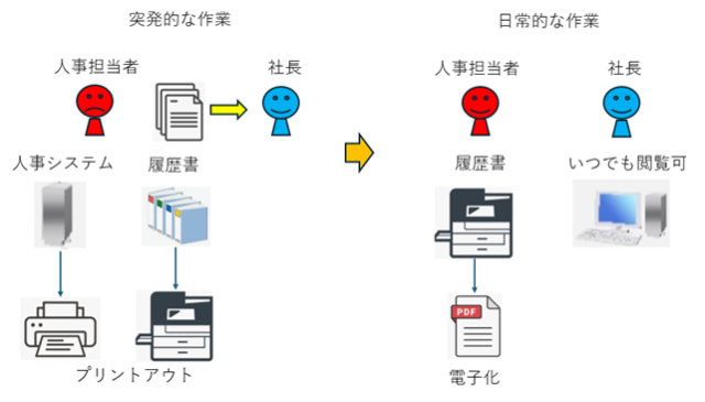 人事部門が社長の指示で、指定社員の履歴書から人事考課履歴、譴責処分などの履歴を印刷して紙で提出していました。突発的に指示が発生して、最優先で対応する必要があるため毎回人事部門は混乱していました。人事システムはオンプレ製品であったため、メーカーにODBC接続でデータベースへのアクセス許可を頂いておりました。履歴書以外のデータについては人事システムから取得できるため、履歴書のみ入社時にスキャンして社員番号をファイル名にして特定フォルダへ保存する運用ルールを確立しました。