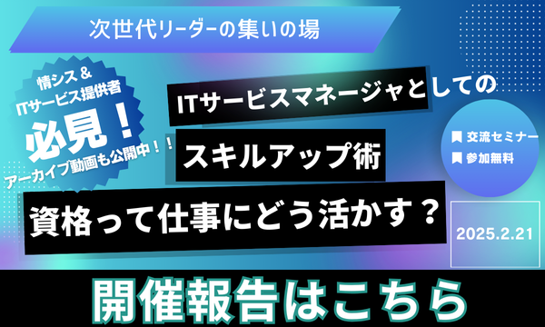 >> 「ITサービスマネージャとしてのスキルアップ術 資格って仕事にどう活かす?」の詳細な開催レポートと動画掲載はこちら